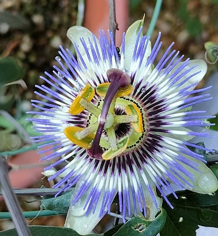 「時計草」?生命力が強く、育ちすぎるので植えるのには適さないそうです。でも我が家では雨の毎日、日替わりで「時計」(そっくり)が開きます。これが又愛おしいのです。しばらくの間たのしませてくれそうです。